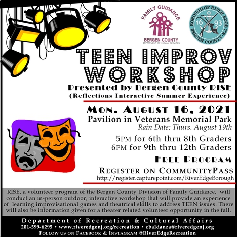 RISE, a volunteer program of the Bergen County Division of Family Guidance, will conduct an in-person outdoor, interactive workshop that will provide an experience of learning improvisational games and theatrical skills to address TEEN issues. There will also be information given for a theater related volunteer opportunity in the fall.
