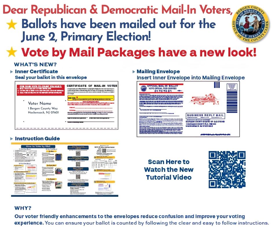 The Official Mail-In Ballots for the 2026 Primary Election were mailed out to the voters with Active Vote by Mail Requests the afternoon of April 21st. Only voters with active vote by mail requests will receive their ballot within 3 days of when they were mailed. Voters with active requests who do not receive their ballot within a week should call 201-336-7020 to request a duplicate. Please note that Bergen county has updated its Vote By Mail materials. Please click here to view the new look.